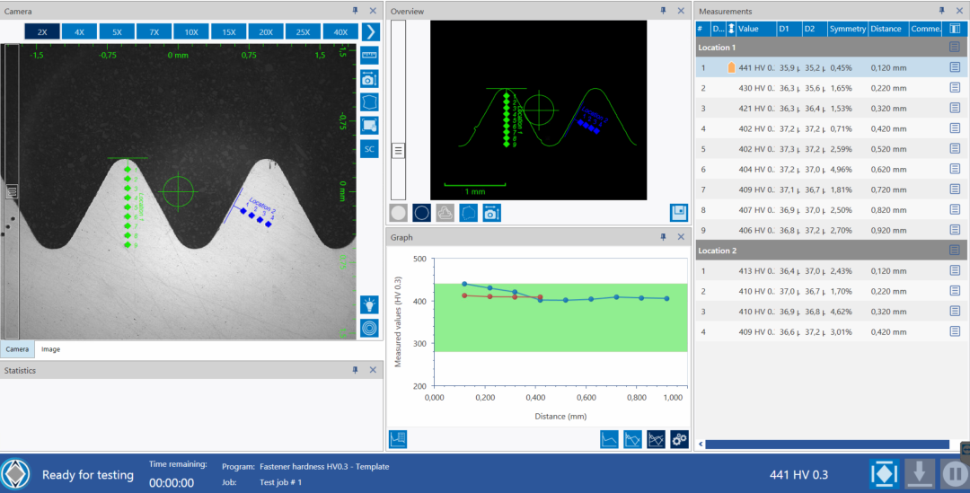 標準中規定的另一種方法是從螺紋的峰頂向螺紋的核心區域進行一系列的壓痕測試。測試結果將顯示從表面到核心區域的硬度變化。這將是一種值得推薦的方法,以突出核心硬度方面的相當大的變化。同樣,也可以在螺距層面進行一系列壓痕,壓痕垂直于表面,如圖4所示。在下面的圖示中使用了維氏硬度壓痕,壓痕間距設置為距表面0.120mm,每個壓痕之間的間距為0.120mm。測試程序中可以設定與芯部硬度正負30維氏/努氏硬度相關的限值,用于脫碳/滲碳評估。當超過這些限值時,會有一個圖示說明是否已經超過脫碳/滲碳限值。