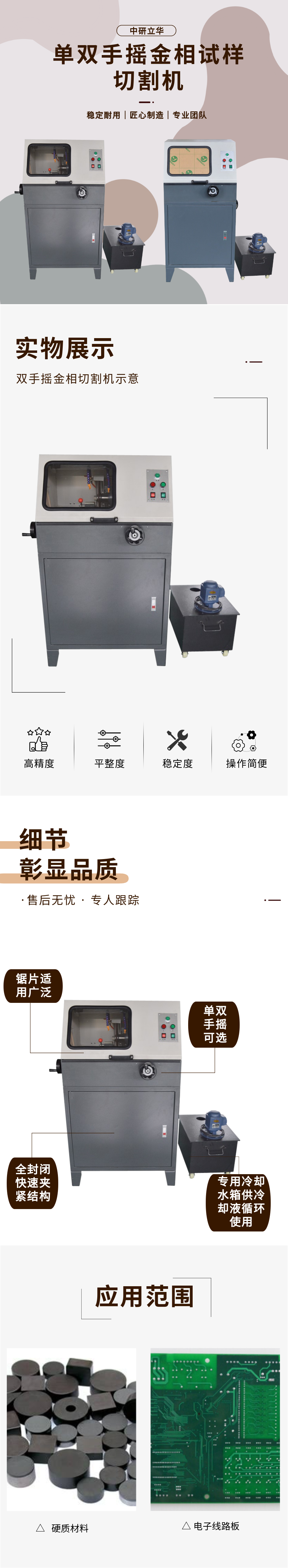 用途:單(雙)手搖金相切割機可適用于切割一般金相、巖相材料,為保證能在安全狀態下切割取樣,本機采用全封閉雙罩殼結構和快速夾緊裝置,并附有冷卻水箱。