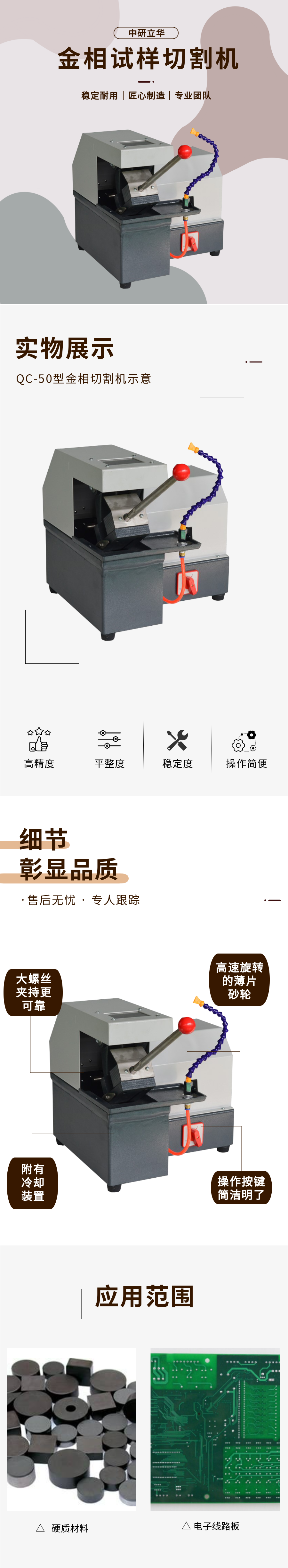 用途:QC-50型利用高速旋轉的薄片砂輪來截取金相試樣,它廣泛地適用于金相實驗室切割各種金屬材料。